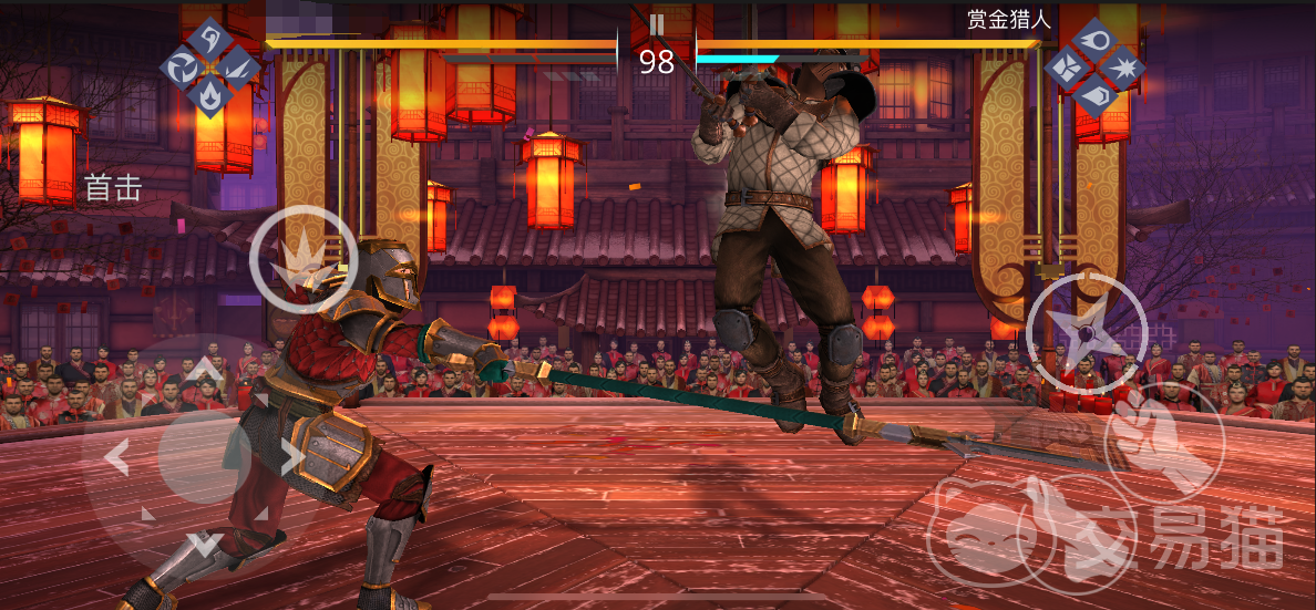首先就是我们最常用的小碎步,由于新手教学没有教大家,所以自己摸索的话还是很困难的,小碎步的触发就是快速的向左或者是向右滑动两下,主要目的就是可以迅速的闪避对手的攻击,同理或者是快速的接近对手;我们和对手距离比较近的时候点击攻击会将其顶开一段距离,根据武器类型的不同没有添加任何轮盘方向键的普通攻击就是会连续攻击一到三下;上加攻击键就是武器的上挑,下加攻击键就是下戳。