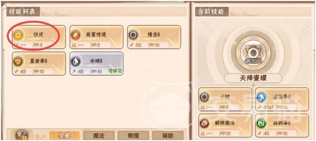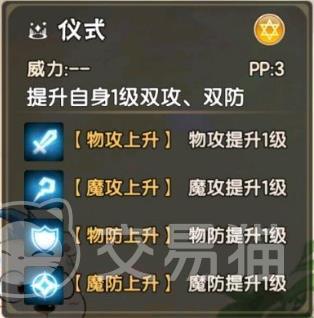 首先【仪式】这个技能属性是非常逆天的,无论是物攻、魔攻、物防以及魔防都能全面提升1级,而且只需要消耗3PP而已,其他技能都不能达到这个属性。