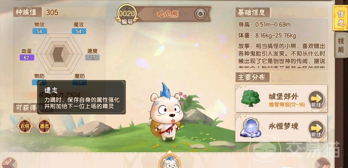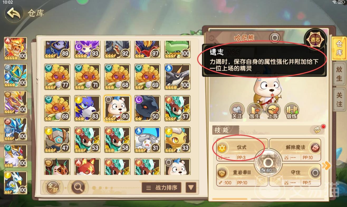 而哈尼熊学习已经学习了【仪式】技能,那么还要跟【遗志】技能搭配好,这两项技能一起的话,可以发挥出自身的强化属性,并且能给附加下一位的精灵,可以说在PVE竞技场中是绝对的神。而哈尼熊属于类似战士一种,在PVE对战中,理应第一个出场,能解决敌方,即使倒下了,自身的属性也能保留给下一位上场的精灵,完美的搭配。