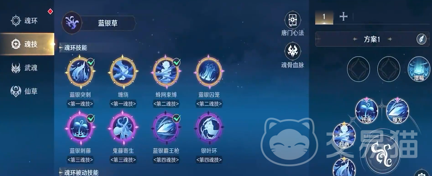 游戏开始时,玩家需从八大武魂中选择一个作为初始职业,如蓝银草、七杀剑、邪火凤凰等。新手建议选择操作简便且输出高的角色,蓝银草武魂远c加控制,而柔骨兔则是贴身肉搏型武魂,都是不错的选择。但是选择与自己喜欢的玩法相匹配的武魂还是更好玩的。选择一个武魂之后最好能够便于快速上手和前期推图。完成新手引导任务后,迅速解锁魂环系统,通过猎魂获得魂环,提升角色战斗力。