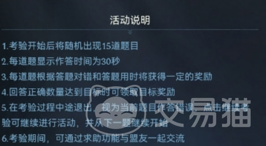 这个考验其实挺简单的,就是给玩家随机出15道题目,每道题都只有30秒的时间让玩家思考并回答。别担心题目不会太刁钻,就是考验下玩家的反应速度和知识广度。万一遇到难题,也别急,游戏还贴心地准备了求助功能,玩家可以找玩家的游戏好友或者盟友一起商量对策,毕竟人多力量大。在互相交流的过程当中,不仅能够得到问题的答案,还可以加深友谊。大家一起互帮互助将这个问题直接解决掉,问题就非常的简单了。