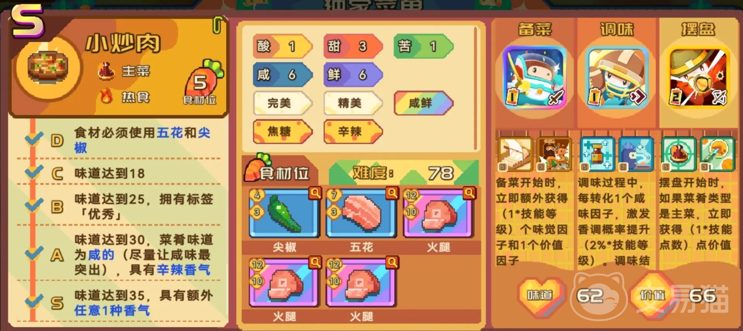 第三个S级的菜品是小炒肉,需要用到的食材是五花肉和尖椒,一共是有五个食材位的,大家还可以加点火腿之类的肉类。