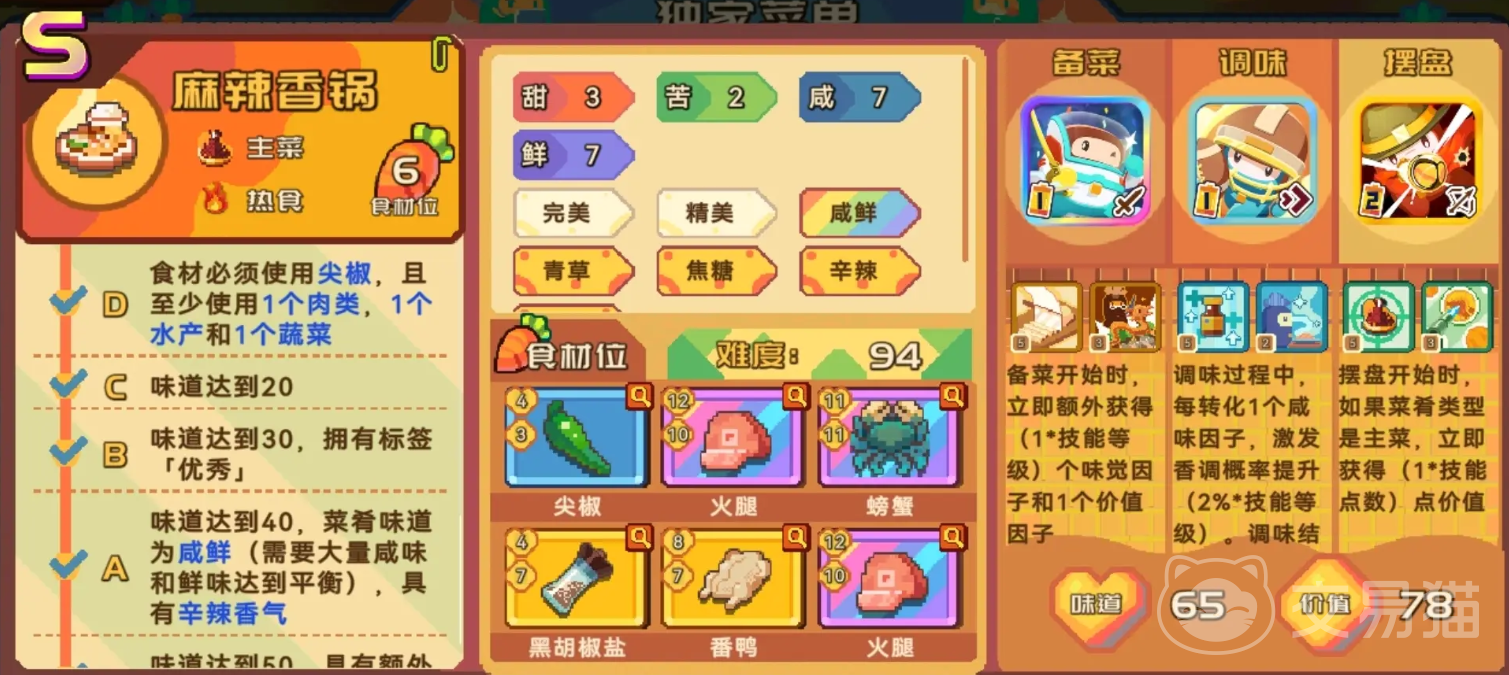 第四个S级的菜品是麻辣香锅,需要用到的食材是尖椒、肉类、水产类和蔬菜,这个菜品一共是有六个食材位的,除了前面这四种必须用到的食材之外还可以加入其他的食材。