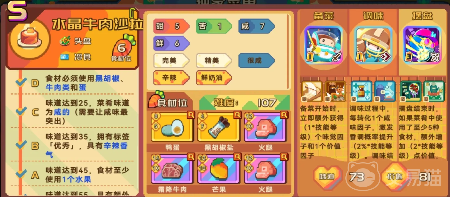第二个S级的菜品是水晶牛肉沙拉,需要用到黑胡椒、牛肉和蛋,推荐大家使用的厨师是剑士和锋卫。