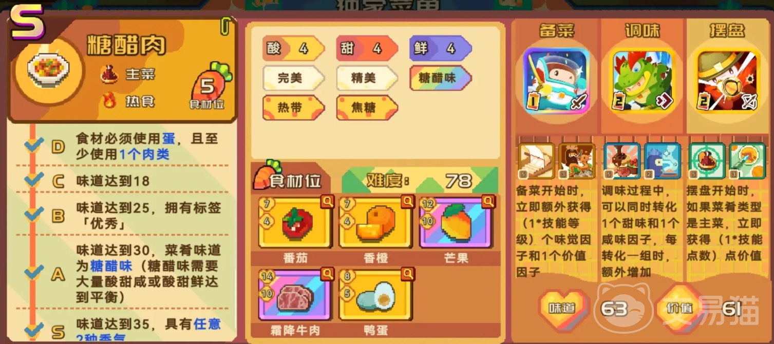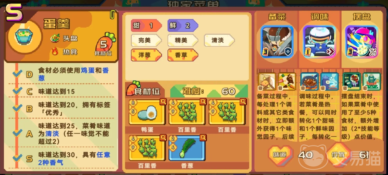 第一个S级的菜品是蛋羹,需要用到鸡蛋和香葱制作,与我们现实中的鸡蛋羹差不多,推荐大家使用到的厨师是锋卫和弓箭手。