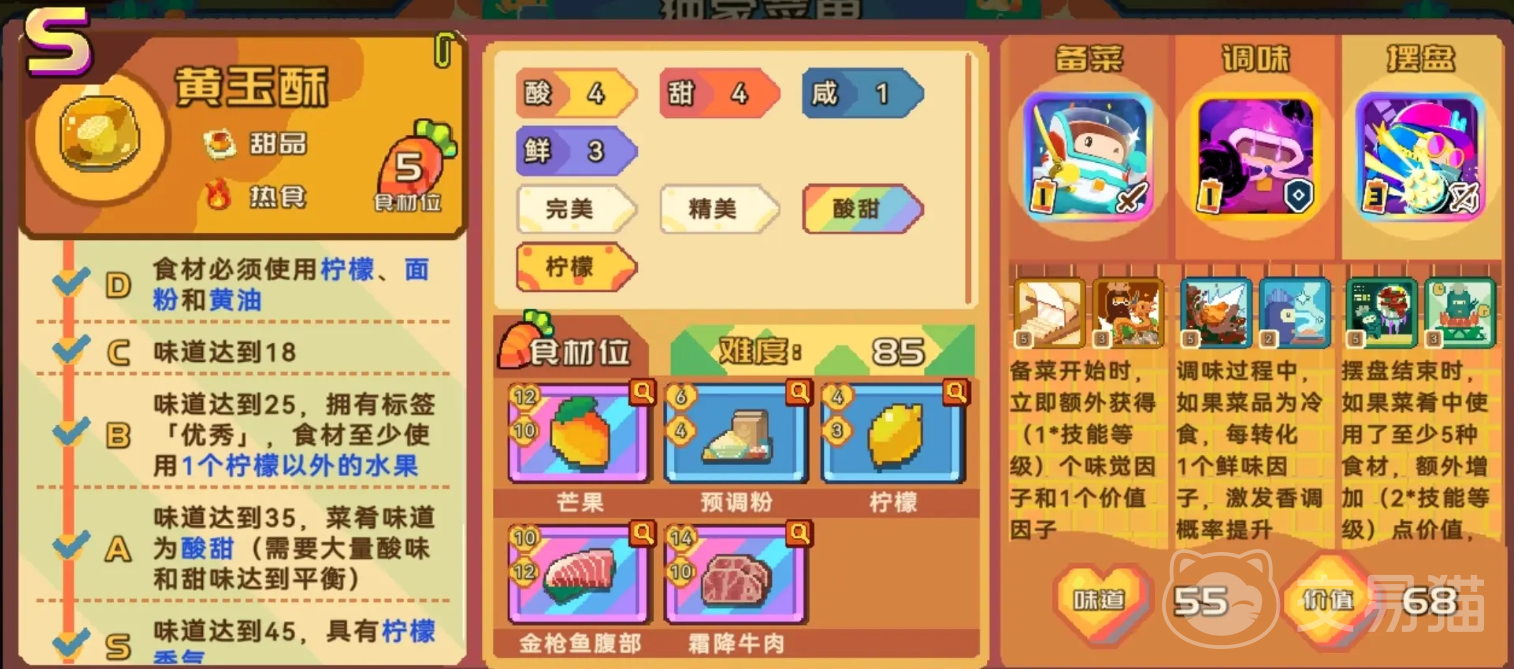 第七个S级的菜品是黄玉酥,需要使用到的食材是柠檬、面粉和黄油,这三个食材是必须要用到的,大家还可以自行添加另外的两种食材加进去。