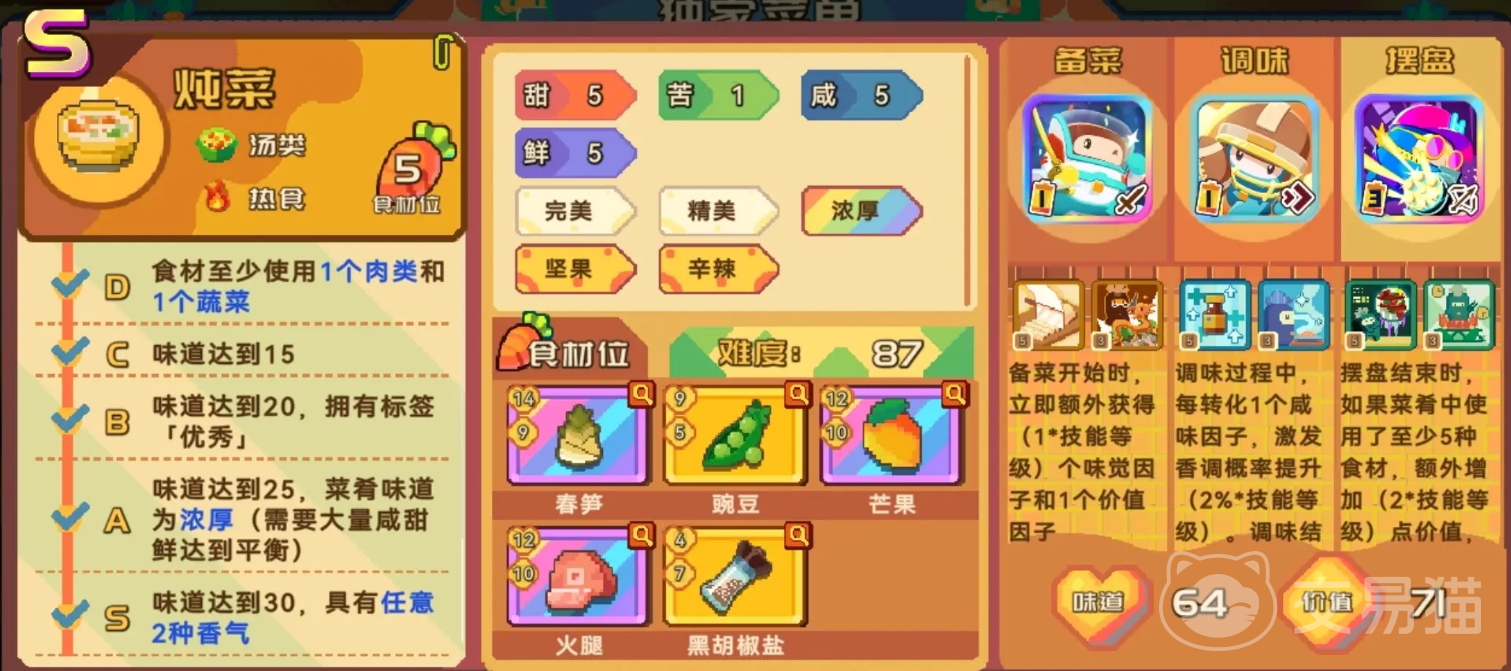第六个S级的菜品是炖菜,需要使用到的食材是肉类和蔬菜,这个菜品一共有五个食材位,除了肉类和蔬菜之外还可以加入其他你喜欢的食材进去。
