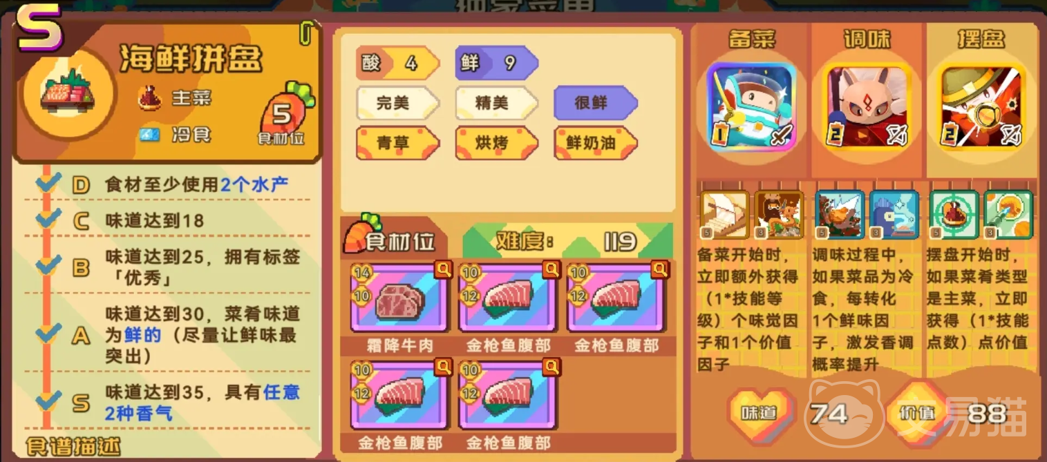 第五个S级的菜品是海鲜拼盘,需要使用到的食材是两个水产类,这个歌菜品一共有五个食材位,大家还可以加入自己开启创意加入其他的食材。