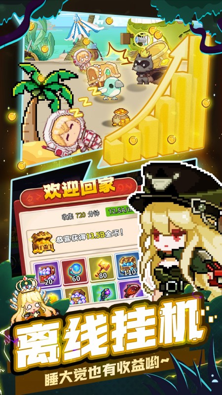 其次游戏中还有着很多丰富的道具可以选择使用,游戏中还设立了轻松的挂机玩法,让大家就算处于离弦的状态也能够获得收益,大家可以通过装备道具和提升角色等级来提高战力。