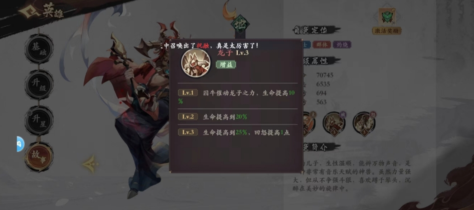 更短的冷却时间意味着囚牛能够更频繁地使用音焰技能,为团队带来持续的灼烧伤害,尤其是在组建燃烧阵容时,他的特殊燃烧效果几乎难以被替代,成为团队中不可缺少的角色,龙子这个被动技能,这个技能触发的时候他的生命值得到了提升,在一级时,这份力量便赋予了囚牛10%的生命加成,让随着等级的提升,二级时生命提高至20%,到了三级,更是达到了惊人的25%,这样的增益效果,无疑是为囚牛站在前排抗伤害、保护队友而量身定制的。