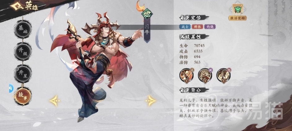 其实在角色原本的神话当中,囚牛就生性温顺,能辨万物声音,对音乐有着与生俱来的热爱与领悟,常常沉醉于琴头的美妙旋律之中,这种特质也赋予了他在战斗中独特的能力,但是强度上面其实他没有办法跟一些高品质角色相比,甚至技能也只有三个技能,角色定位在战士|上面,本身是可以带来群体灼烧的,如果大家是想要组建一个燃烧阵容的话,其实还是可以用他的,毕竟在技能效果上面很难有几个角色替代他的特殊燃烧效果。