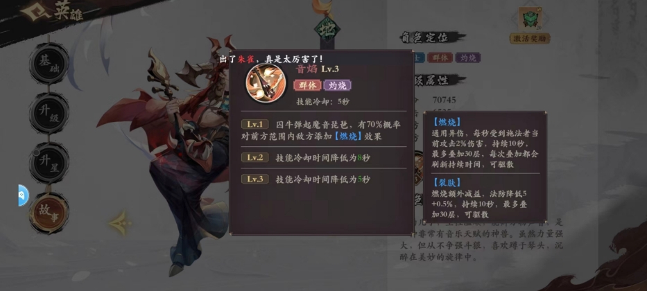 每一次叠加都会刷新燃烧效果的持续时间,使得这个技能在战场上连续的时间是比较长的,其次玩家在使用此技能时需格外小心,因为裂肤效果的存在可能会削弱燃烧的额外减益效果,降低法术防御力,同样也是可驱散的,后期随着技能等级的提升,音焰的冷却时间会缩短,从最初的较长冷却时间逐渐降低至8秒,再到最终的5秒,这一变化其实也提高了囚牛在战斗中的灵活性和持续输出能力。
