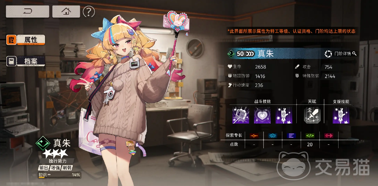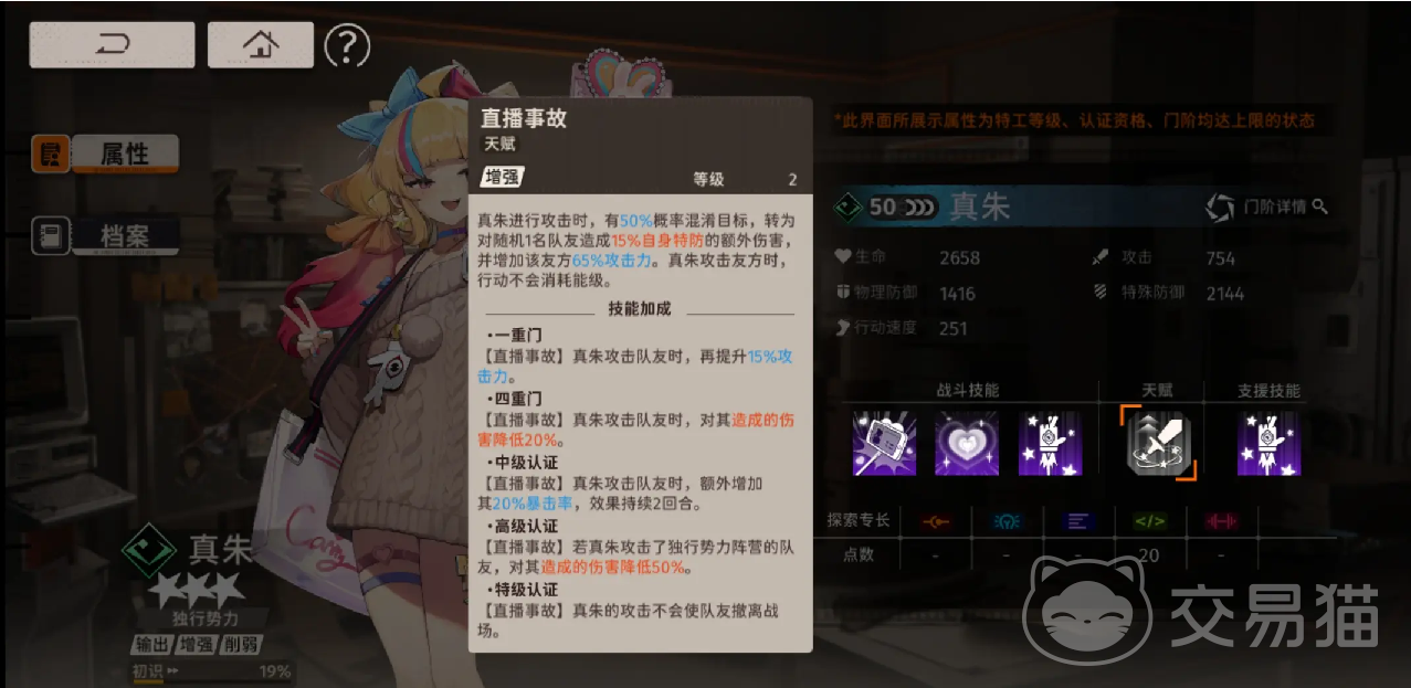 ”互动环节”是她的大招,也就是超限技,技能效果也比较简单粗暴,选定敌人后可以对敌方造成339.98%的特殊伤害。重点其实还是她的天赋效果”直播事故”,能够对角色的能力进一步的增强。