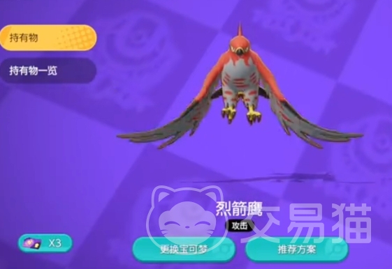 想要再度提高烈箭鹰的攻击力可以试下持有物,每个精灵可以携带3个持有物进入战场,适合烈箭鹰的持有物可以是哑铃、轻石和锐利之爪。哑铃是烈箭鹰必须携带的,能够提高它的物理属性,轻石可以提高20%的加速,锐利之爪可以增加供给和给对方减速的效果,这个配合烈箭鹰的【飞天】技能非常好用。