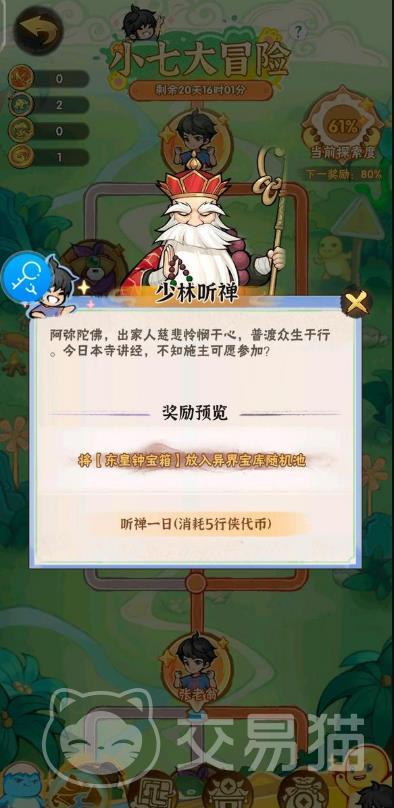 还有这个小七大冒险并不只是答题而已,这一个活动一路上探索下来,还有一些闯关游戏,因为有一些问题需要在闯关中找到答案,比如将【东皇钟宝箱】放入异界宝库的随机池,这也是其中一个任务,其他的还有一些副本扫荡,掉落的字条等等。