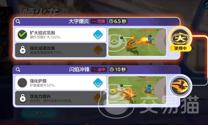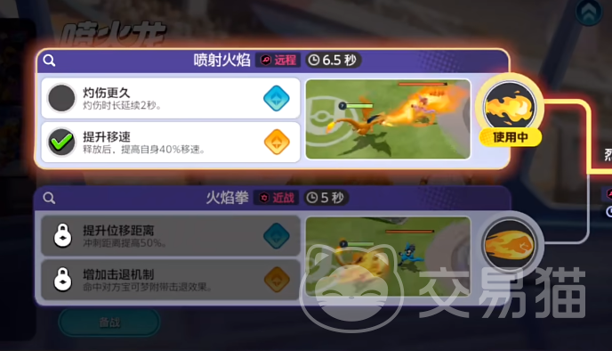 相对来说比较重要的就是角色的一技能,二技能以及大招,角色的一技能可以直接超对手喷火,对手一旦被火焰伤害到,那直接会进入到烧烧状态,喷火龙的移动速度可以短时间内得到提升,在角色进化之后,分别有喷射火焰和火焰拳可以选择,最推荐的就是火焰拳,这是角色的主要输出技能,在对战的时候能有很强的灼烧作用,并且火焰拳还能有一定的击退效果。