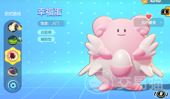 幸福蛋这个角色的外观非常粉嫩,是很多女生都比较喜欢使用的一个宝可梦,这个角色本身属于近距离的辅助,可以帮队友在游戏里不断输出,角色的普攻和大招以及被动都是固定好的,只有一技能和二技能能在升级之后选择不同的招式搭配,现角色的一技能是拍击,可以向指定的方向拍打攻击,既能产生范围伤害,同时也可以在这个过程中降低对方的移动速度。