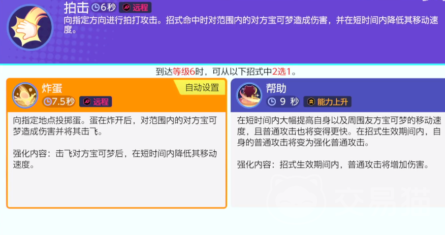 在角色达到6级之后可以获得炸弹和帮助这两个招式,这个时候推荐玩家选择帮助,这是一个辅助招式,使用之后可以提升自己以及周围其他宝可梦的移动速度,还能把普通攻击转化成强化普通攻击,之所以要选择帮助这个辅助技能是因为角色本身就比较偏向于辅助类型的角色。