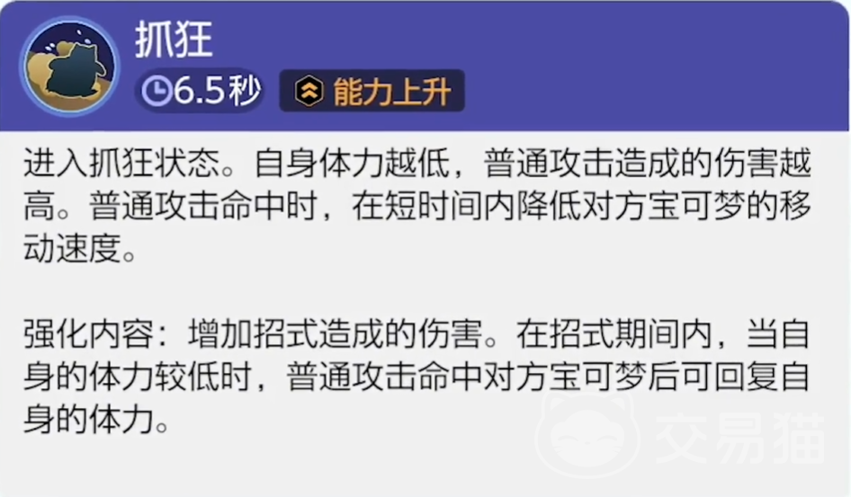 在本作中卡比兽还原了原版中身躯庞大行动笨拙的设定,其外观身躯庞大行动较为迟缓看起来呆呆萌萌的,而且血量很高防御极强因此其定位属于防御型宝可梦,坦度高血量足且技能组搭配简单,上手难度低属于新手必备的前排防御类角色,稍加了解技能组就能直接上手。卡比兽的普攻能够每第3次时获得强化,命中后产生小范围的伤害且向对手施加减速效果降低移速。被动效果是贪吃鬼能够让其在寻找树果时拥有更多的移速,距离越近获得加成越明显,大概能够提升20%的移速效果,而且吃掉树果后会获得一定时间的增益。
