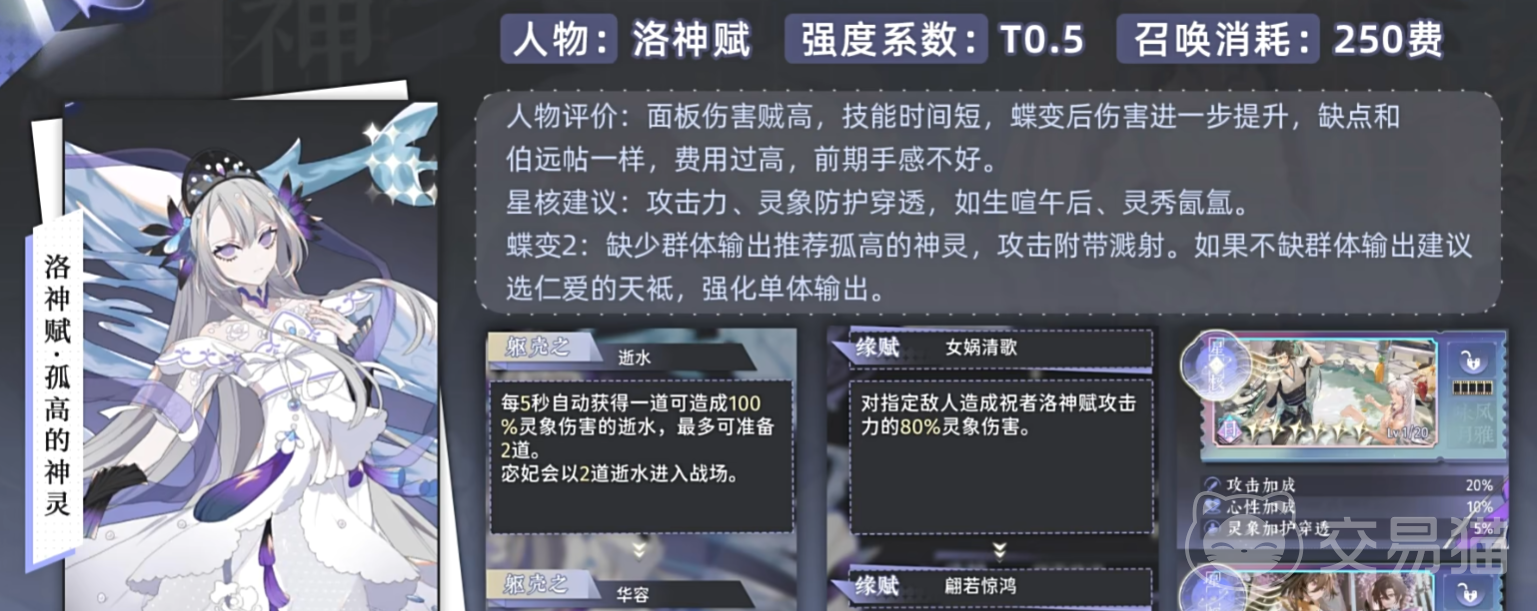 如果抽不到他的话,也可以选择洛神赋,基础伤害面板很高。而且冷却时间短,拥有强大的单体输出能力。若是缺少群体输出角色,蝶变2之后可以选择攻击附带溅射,可以一次性攻击多个敌人,就算前期资源匮乏,依旧可以快速推进主线关卡。