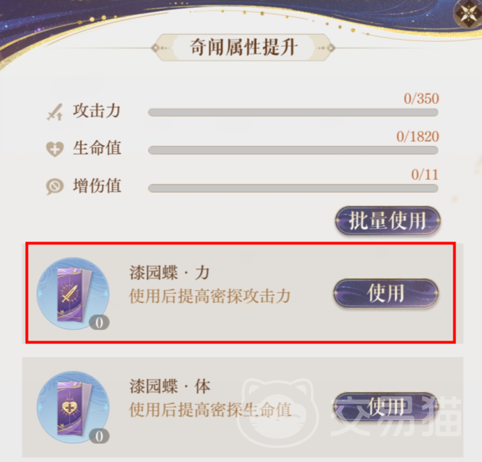点击“提升”进入加成页面,这时候消耗不同类型的漆园蝶就可以提升对应的属性。不同类型的密探可以提升属性是有区别的,像阿蝉这里作为输出密探,着重要加的就是攻击力,也就是“漆园蝶·力”,可以最直观的提升阿蝉的追击斩杀线,至于其它属性则暂时不考虑。