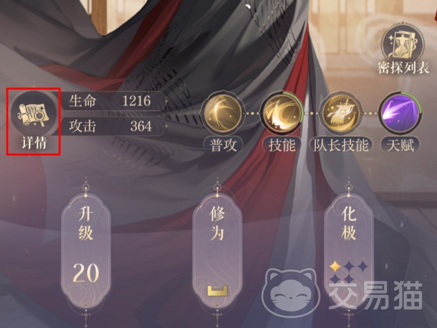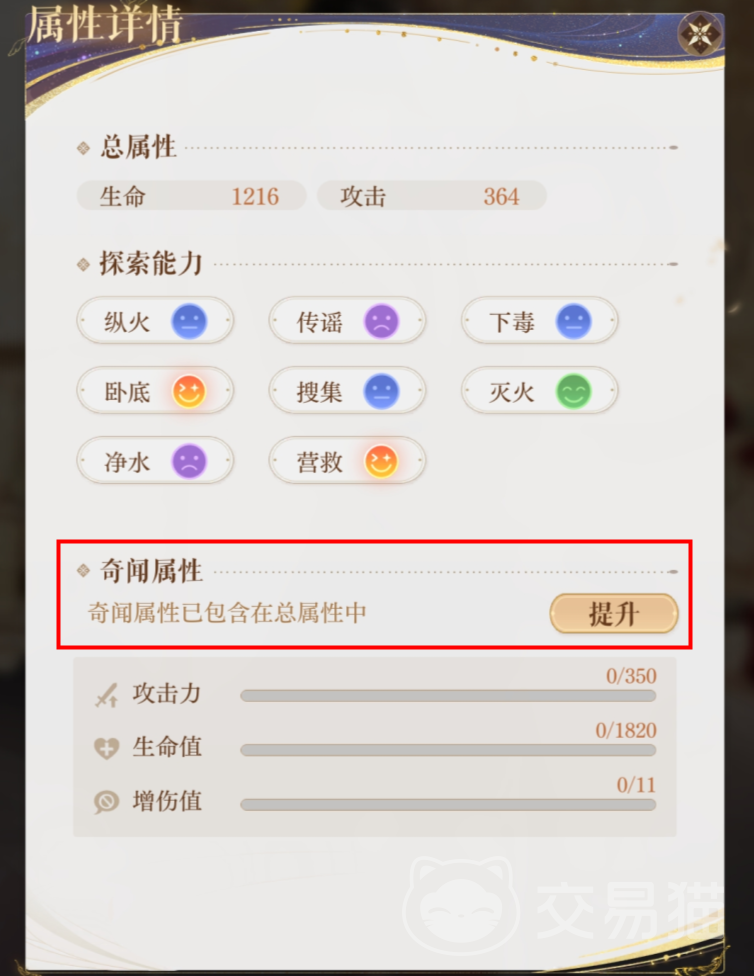 大家密探界面的左侧点击“详情”,会弹出一个属性详情界面,在该界面大家可以查看密探的生命共计、探索能力以及奇闻属性,这的奇闻属性就是可以给密探提升的属性。包含攻击力、生命值、增伤值这三种加成。