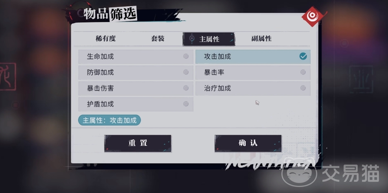 为欲影选定好套装后,各潮品的主属性选择就比较灵活了。其中帽子和衣服是固定的主属性,玩家们只用在筛选中挑出游充能和攻击力加成的潮品来给欲影装上即可,要是玩家们手里没有能同时满足这两个副词条的潮品,那么在选择可优先考虑充能,其次才是攻击力加成。