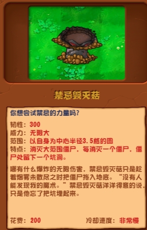 不过也有另一种说法,就是爆炸并不是无限伤害,而是毁灭菇在烟雾未散尽的时候,将僵尸拖入地底,这也是它的一个魔法,需要花费200点阳光才可以种植,而且冷却速度非常的慢。