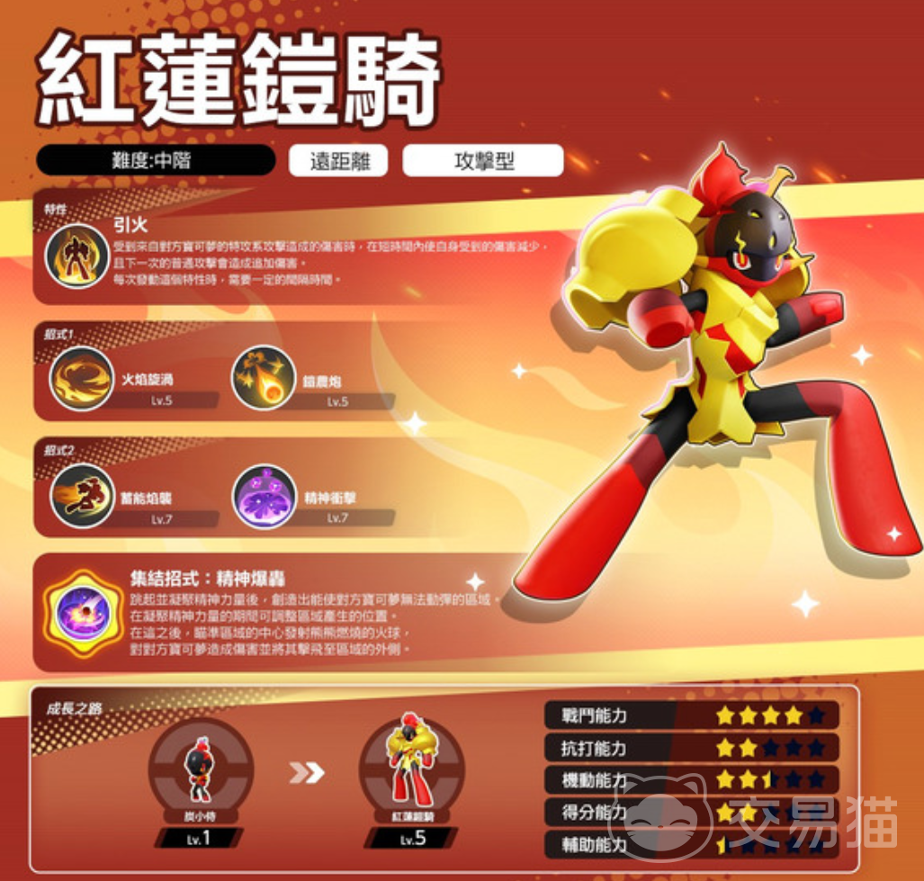 红莲铠骑在游戏中定位为攻击型法师,拥有惊人的7100血量,在攻击型宝可梦中名列前茅。其技能组合包括燃尽、火焰旋涡与铠农炮等,每个技能都各具特色。燃尽技能能造成燃烧效果,降低对手恢复效果,火焰旋涡则能在造成伤害的同时提升双防,并叠加效果,铠农炮则是一发能量炮,能禁锢敌人并造成高额伤害。