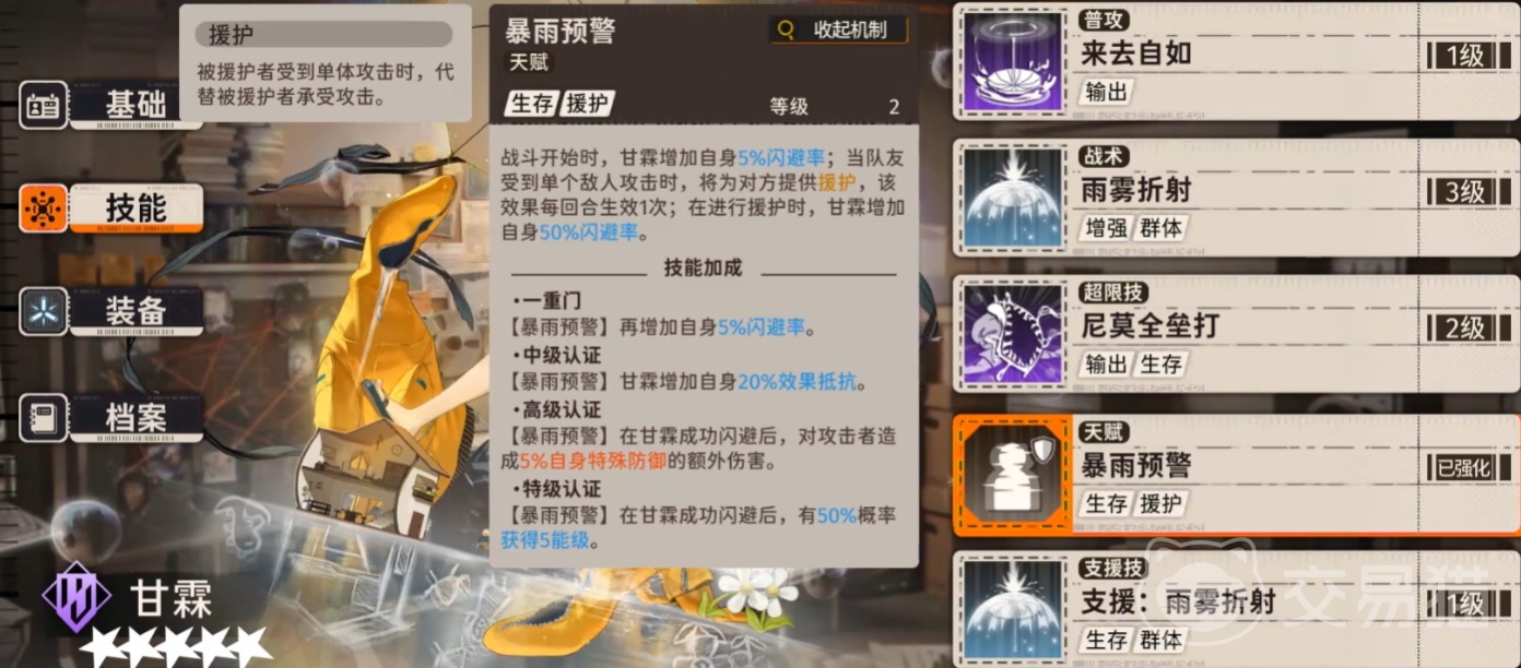甘霖的天赋技能暴雨预警会在战斗环节开始时,为甘霖自身增加百分之五的闪避率,如果有队友受到了敌人攻击时,还可以帮助队友增加援护,这个效果每个回合都可以生效一次,并且在为队友进行援护时,还可以让甘霖自身增加百分之五十的闪避率。