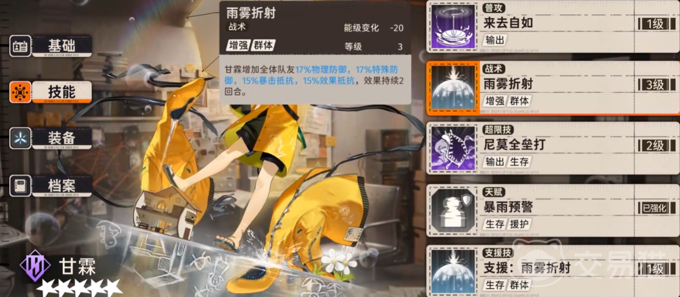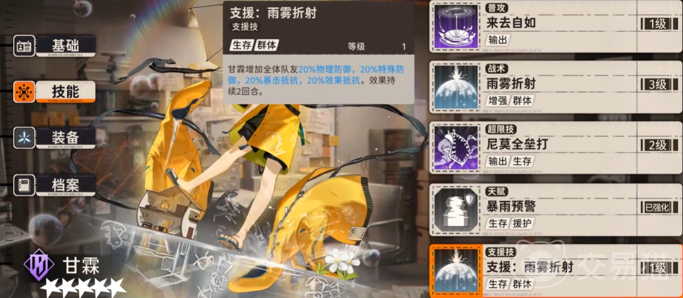 甘霖的支援技能雨雾折射可以为全体的队友增加百分之二十的物理防御、特殊防御、暴击抵抗和效果抵抗,这个增益效果可以持续两个回合。