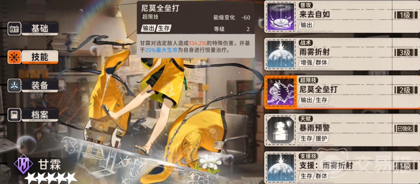 甘霖的超限技能尼莫全垒打可以对指定的敌人造成134.2%的特殊伤害,并且同时还可以对自身进行治疗效果,这个效果基于甘霖目前百分之二十五的最大生命值。