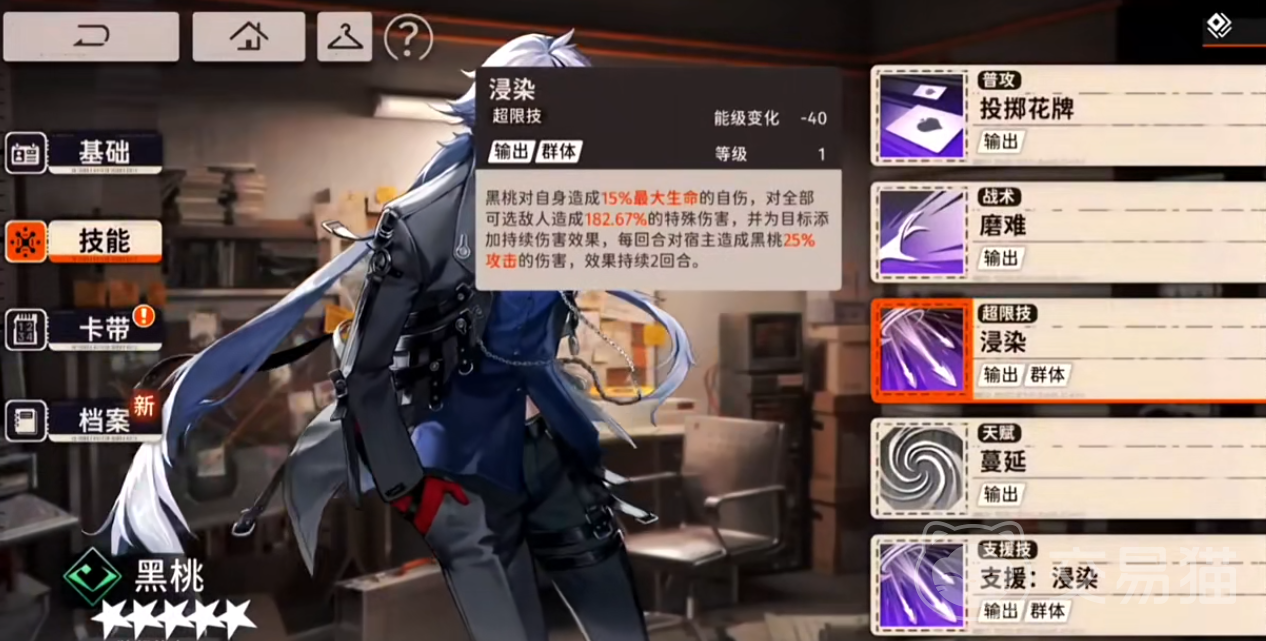 黑桃的超限技能浸染可以对全部的敌人造成高额的特殊伤害,同时添加持续伤害的效果持续两回合,不过会对自身造成百分之十五最大生命值的自伤。