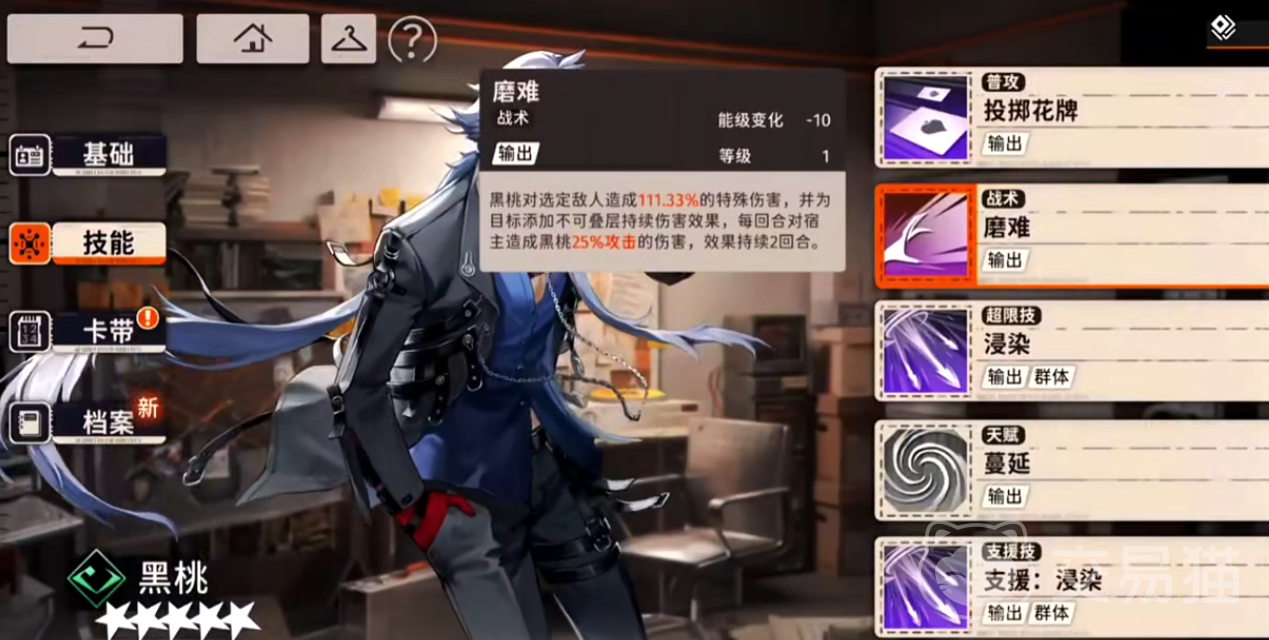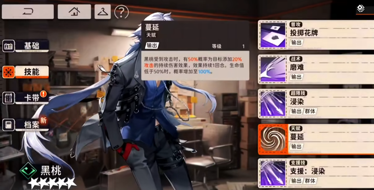 首先是黑桃的天赋技能,在战斗中,黑桃受到敌人的攻击时,有一般的概率可以为木匾增加百分之二十的攻击持续伤害,如果这时黑桃的生命值低于百分之五十的话,这个概率会变成百分百,而且这个效果是持续一个回合的。