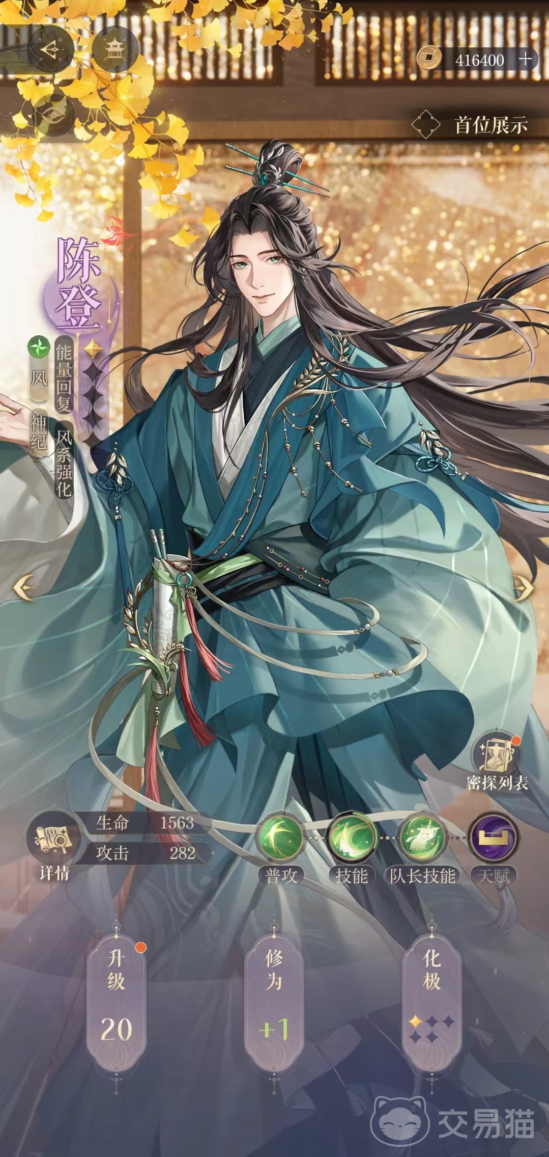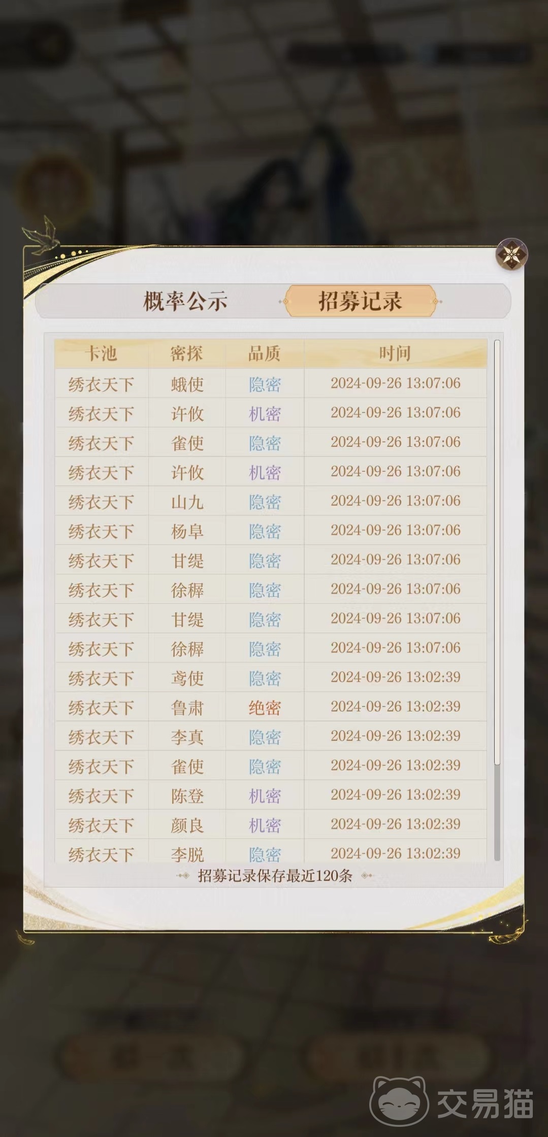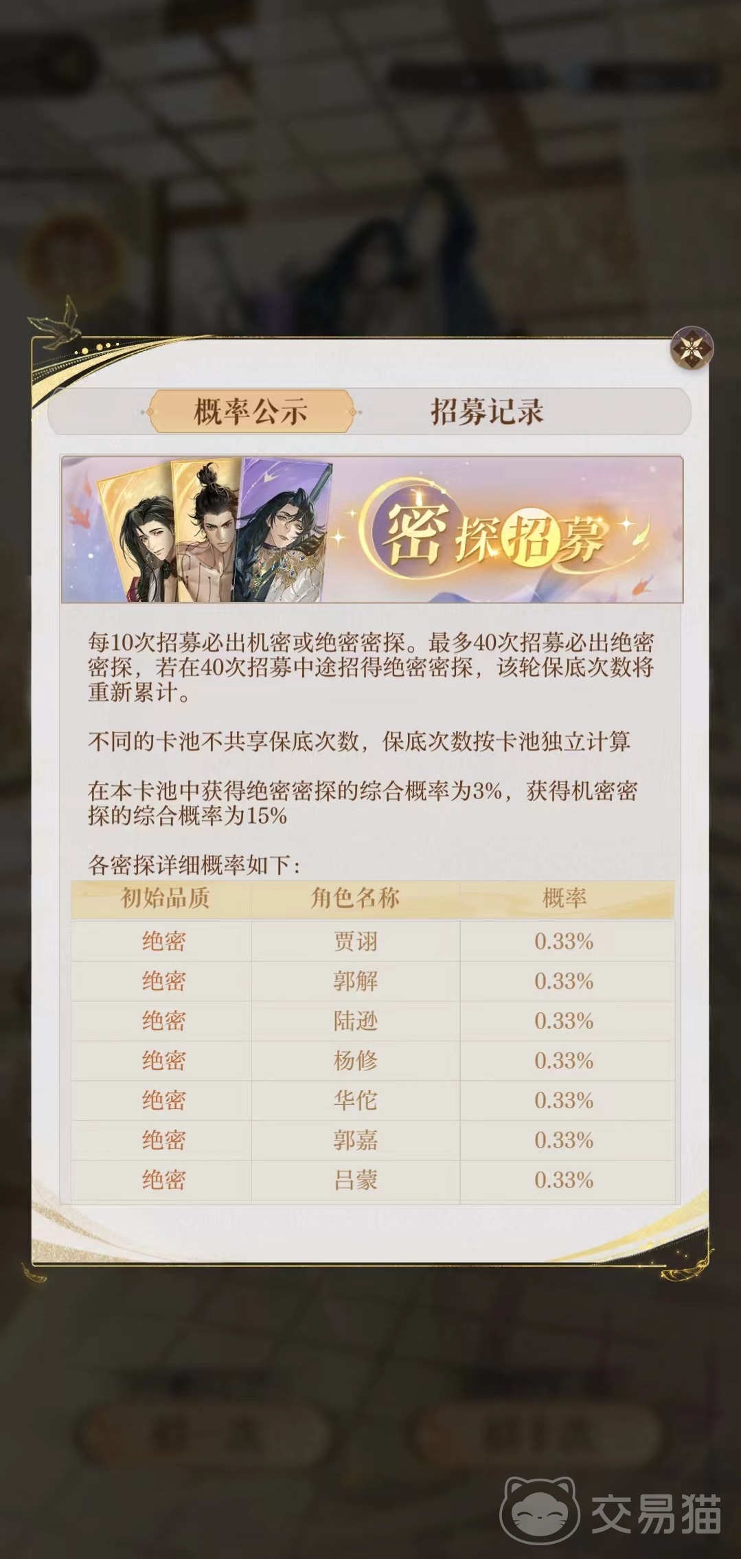 目前游戏中出现的密探品质,从低到高分别是隐秘,机密和绝密,绝密是目前的最高品质。卡池中可以抽取到的绝密品质密探一共有九个,分别是鲁肃,贾诩,郭解,陆逊,杨修,华佗,郭嘉,吕蒙和王粲。机密级别的密探一共有八个,分别是陈登,文丑,颜良,阿禅,许攸,史子眇和严白虎。隐秘级的密探数量就比较多了,例如严颜、崔烈、周群、楼班等。综合来说,在卡池中获得绝密密探概率为3%,获得机密密探综合概率为15%,所以抽卡率方面还是比较不错的。