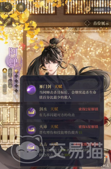 阿蝉的技能效果是单体,所以在攻击属性可以叠加,阿蝉做好用的闪避天赋在2星的时候解锁是阿蝉在战斗中自保的手段。所以这攻击力上就非常重要,主星石推荐阿蝉使用【天府】能够为密探增加8.35%的攻击力纯加攻击。【太阳】也适配阿蝉能够增加确定的攻击力数值255。