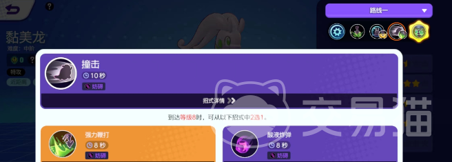 黏美龙第二个小技能是撞击,会对敌方造成伤害和击飞,升级后可以选强力鞭打和酸液炸弹,强力鞭打会对敌人造成伤害和减速后将其拖拽向黏美龙,酸液炸弹会向前方投掷出酸性液体,造成范围伤害和减速。
