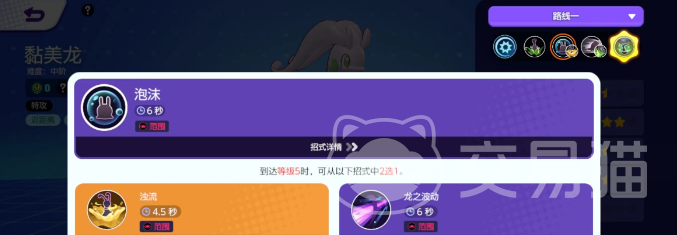 它的第一个小技能叫泡沫,这是个两段技能,使用后第一段会给护盾,第二段会因护盾破碎对周围敌人造成伤害和击飞,这个小技能要在升级后从龙之波动和浊流中选择一个,龙之波动会发射一个中距离的多段伤害激光,如果击中的敌人在黏滑状态还能恢复大量血量,浊流会让附近范围内的敌人减少伤害并增加自身特防和物防,这也是大家比较经常选的技能,可以让其在团战中更肉。