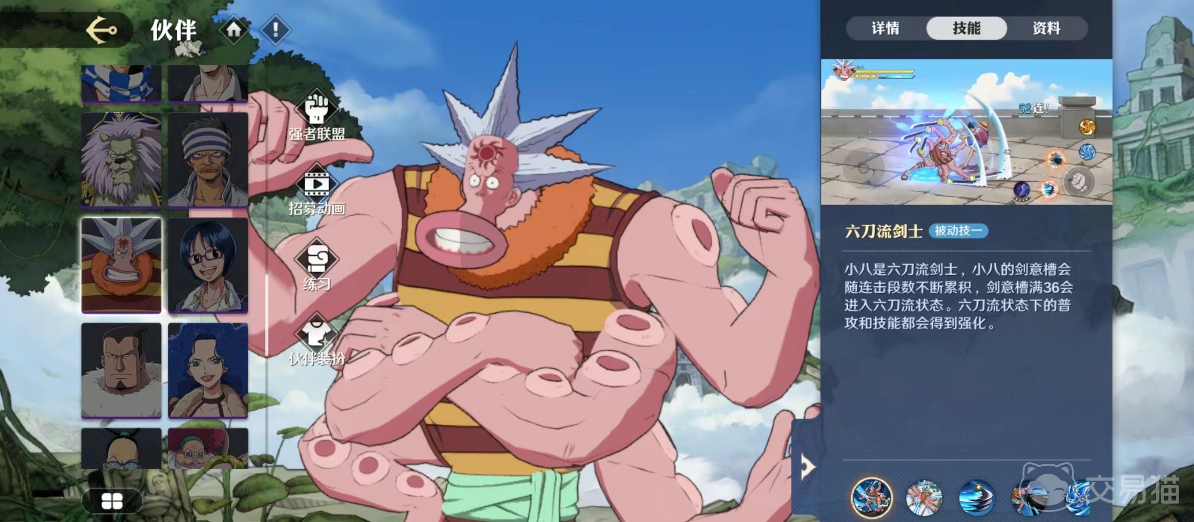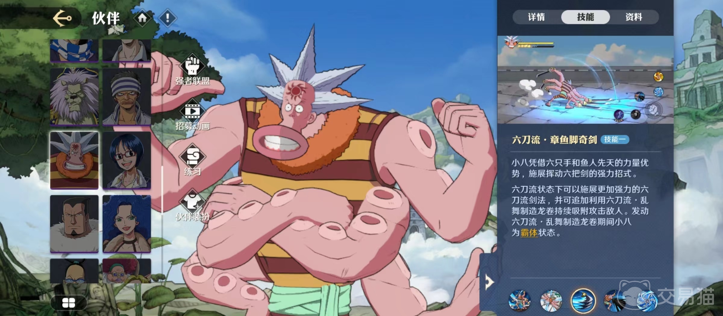 在航海王系列作品的众多人物形象中,小八的形象非常独特,它是一只八爪章鱼,有着很搞笑的外形,现在也成为航海王壮志雄心中大家可以操纵的角色之一,小编就来介绍一下航海王壮志雄心小八技能有哪些。小八的称号是六刀流,它是属于勇气风格的角色,需要通过命中敌人来增加奥义点数使出大招。