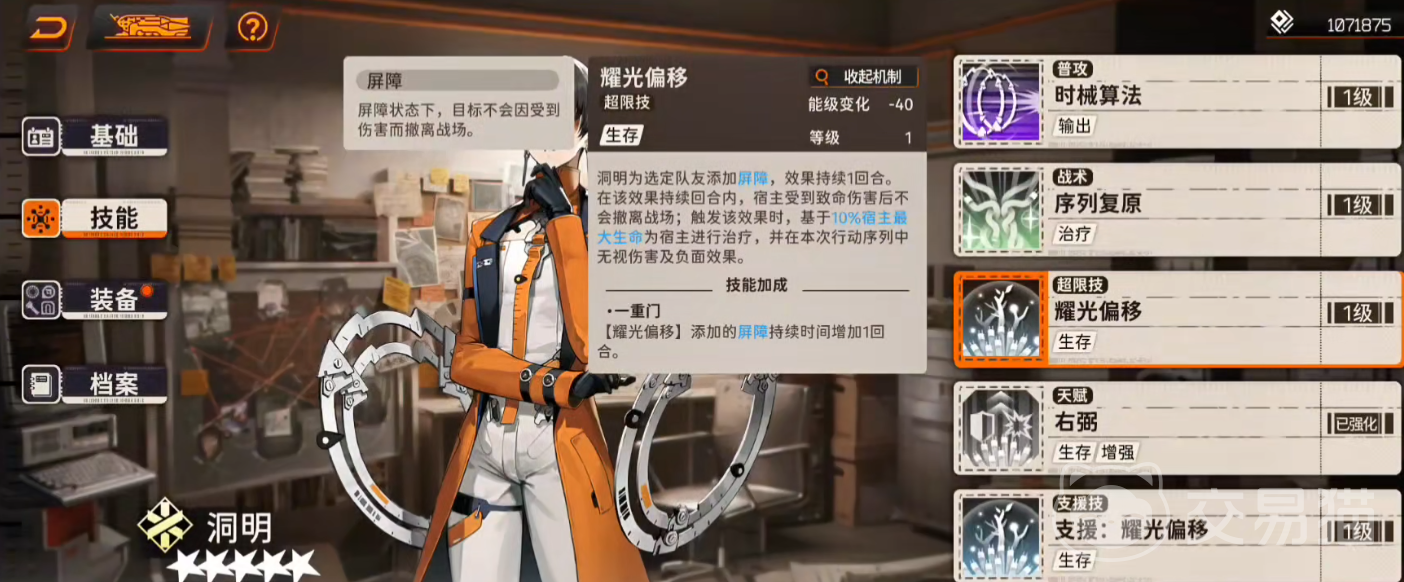 其次是洞明的超限技能耀光偏移,这一技能可以为指定的队友添加一层屏障并持续一个回合,并且在这个回合内,受到屏障效果的队友在受到致命伤害后不会撤离战场。另外在这个效果触发时,还可以为宿主进行治疗,并且还会在这次的行动中无视伤害和负面效果。