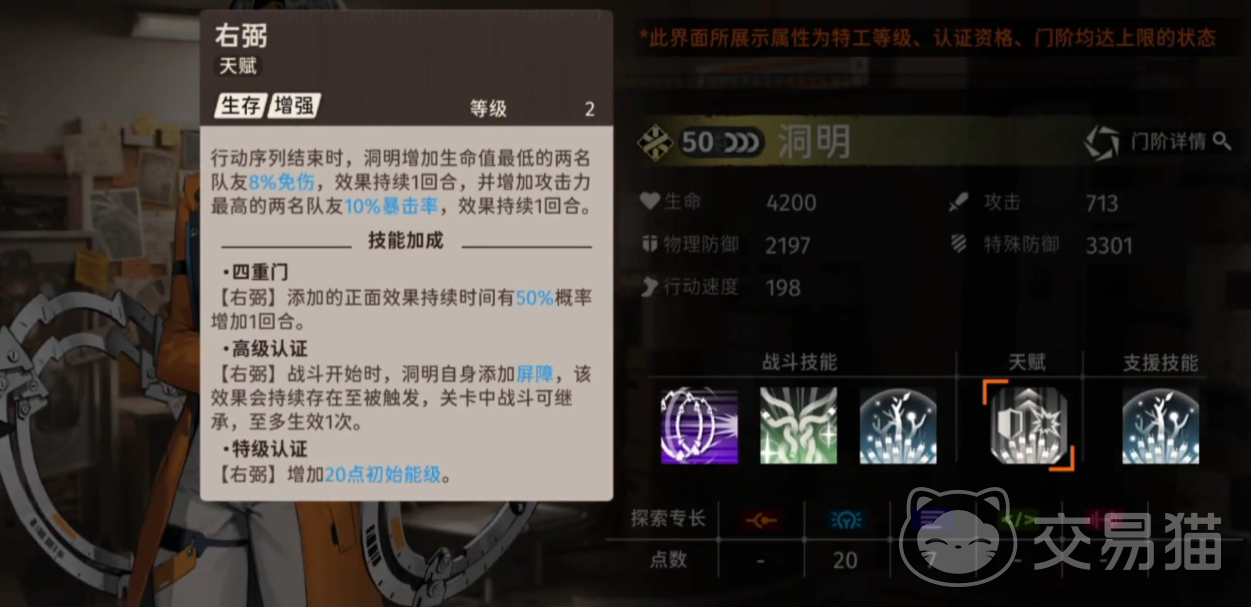 洞明的天赋技能右弼可以为两名生命值最低的队友带来百分之八的免伤效果,并且还会增加两名攻击力最高的队友百分之十的暴击率,这两个效果都可以持续一个回合。
