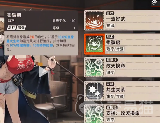 她的战术——锁微启,这一技能让石燕在治疗的同时增加目标的防御能力。虽然需要承受5%的自伤,但能够基于15.04%自身最大生命值的治疗效果,以及10%的物理和特殊防御提升,让她成为队友间不可或缺的保护者。持续三回合的效果确保了团队的稳定性。
