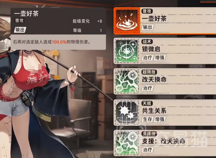石燕的普通攻击叫作一壶好茶,它不只是简单的输出。在战斗中,她能对选定敌人造成142.93%的特殊伤害,同时增加团队的能级变化,这种设计使得她在团队中总是保持活跃,并为大招的释放做好准备。