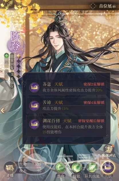 苏息是他的第一个天赋,这位风属性的密探角色在天赋技能的解锁上也是需要升星的,当其天赋密探达到2星时,我方全体风属性密探的攻击力将获得提升,高达20%,这一增益效果能够极大地增强我方队伍的输出能力,随着天赋密探进一步提升至4星,陈登将解锁苦谛天赋,这一天赋将为苏息带来15%的攻击力提升,使得他在战斗中更加厉害,无论是面对单个敌人还是群体战斗,他都能凭借这一天赋技能发挥出比之前更强的战斗力。