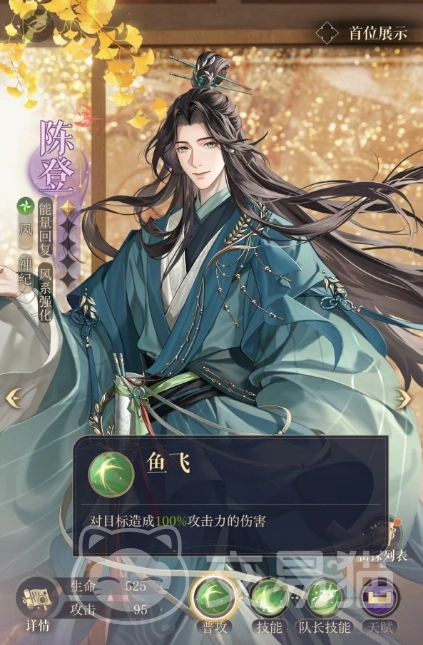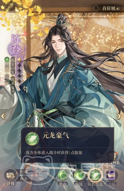 在游戏中,陈登的普攻技能鱼飞能够对目标造成100%攻击力的伤害,这一技能释放迅速,同时他的其他技能也与风系强化和能量恢复紧密相关,广陵散,作为陈登的主要技能,其威力不容小觑,当陈登使用这个技能时,我方全体成员将获得1点能量的增益,同时攻击力也将提升7%,这一效果将持续2个回合,为我方队伍提供持续的战斗支持。