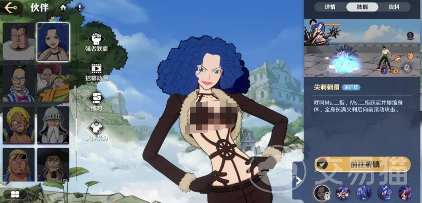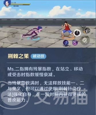 在航海王:壮志雄心这款游戏中,毒蜘蛛这一角色实际上对应的是原作漫画中的Ms.二指,所以航海王壮志雄心毒蜘蛛是谁大家直接看关于二指的信息就知道了,在游戏当中她是一位拥有荆棘之果能力者,这种恶魔果实赋予她将全身变为尖锐棘刺的能力。