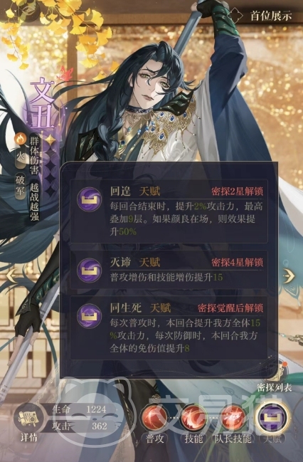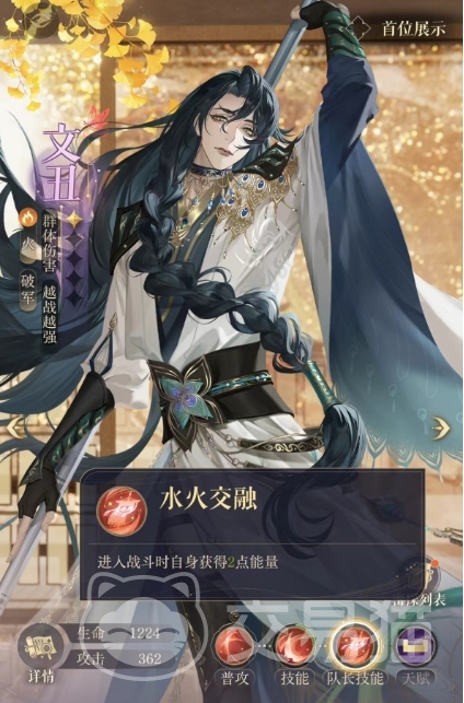 除了强大的技能外,文丑还拥有一个队长技能叫做水火交融,在一开始进入战斗时,文丑自身就会获得2点能量,但是这个技能并没有给队伍其他成员带来任何加成,因此并不太适合作为队长使用,尽管如此,文丑依然是一位有实力的角色,在游戏中的品质也算是中等的,前期大家也是可以稍微培养一下的,文丑在达到2星时就可以解锁回遑天赋,这个天赋触发的时候,每回合结束时,文丑能够提升2%的攻击力,最高可以叠加9层。