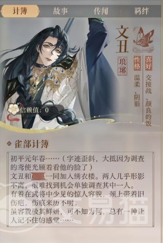 文丑他是初平元年春与颜良一同加入绣衣楼的,两人几乎形影不离,使得单独调查其中一人变得极为困难,在外观上,文丑拥有一种在武将中少见的惊人容貌,他的颈上带着一道旧伤疤,这道伤痕来历不明,但后期可能会在剧情中出现关于这伤痕的线索,尽管文丑的容貌极其鲜妍,但他却总给人一种让人记不住的感觉,这也是他非常适合做密探的原因之一。