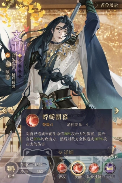 性格方面,文丑比较温柔,但同时也阴狠,这种反差使得他在战场上更加难以捉摸,他喜好交接战,普攻大戟可以对目标造成100%攻击力的伤害,而他的主动技能蜉蝣朝暮,使用时可以对自己造成当前生命值20%攻击力的伤害,提升自己20%的攻击力,然后对敌方全体造成107%攻击力的伤害,这一技能不仅展现了文丑的强大攻击力,也体现了他在战斗中愿意付出代价以换取胜利的决心。