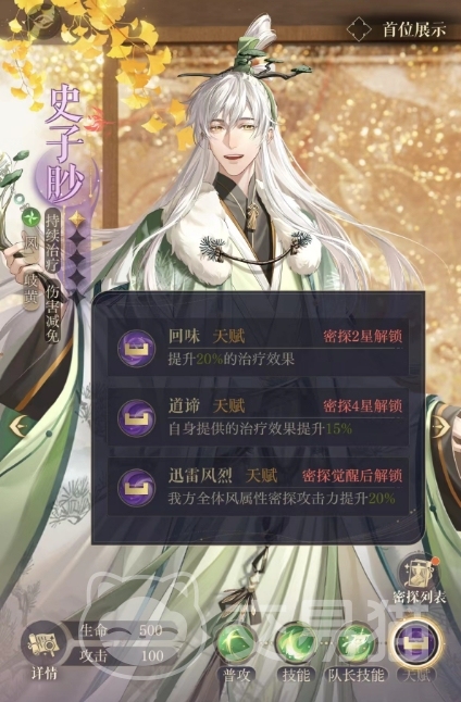 游戏中的史子眇天赋之一是回味,这个天赋在密探达到2星时解锁。它可以提升20%的治疗效果,使得史子眇的治疗技能更加有效,无论是回家吃饭还是其他治疗技能,回味天赋都能够增加它们的治疗效果,当史子眇的密探等级达到4星时,他会解锁道谛天赋,这个天赋可以自身提供的治疗效果提升15%。当史子眇进行觉醒后,他将解锁迅雷风烈天赋,这个天赋可以使我方全体风属性密探攻击力提升20%。